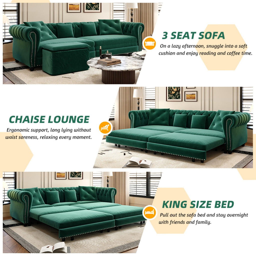 3 In 1 Pull Out Sofa Bed, Convertible Sleeper Sofa Bed, 3 Seater Sofa With Movable Ottoman - Green