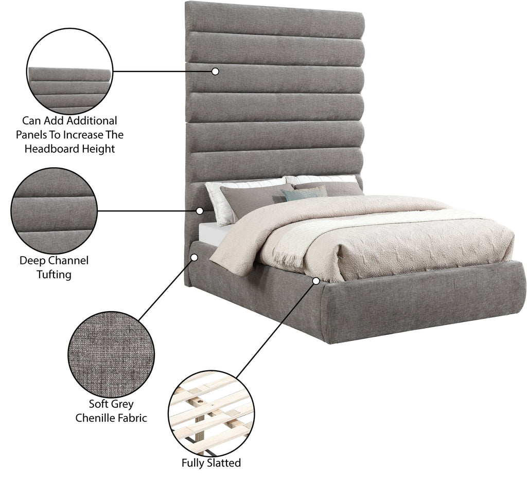 Revealing the silky, soft Adam chenille bed, showcasing deep channel tufting and a contemporary design to add a touch of modern elegance to your bedroom. Its fully slatted construction eliminates the need for a box spring, while the option to add additional panels allows you to customize the headboard height. Crafted for both style and durability, it becomes the centerpiece of your bedroom, creating a sophisticated and inviting atmosphere.