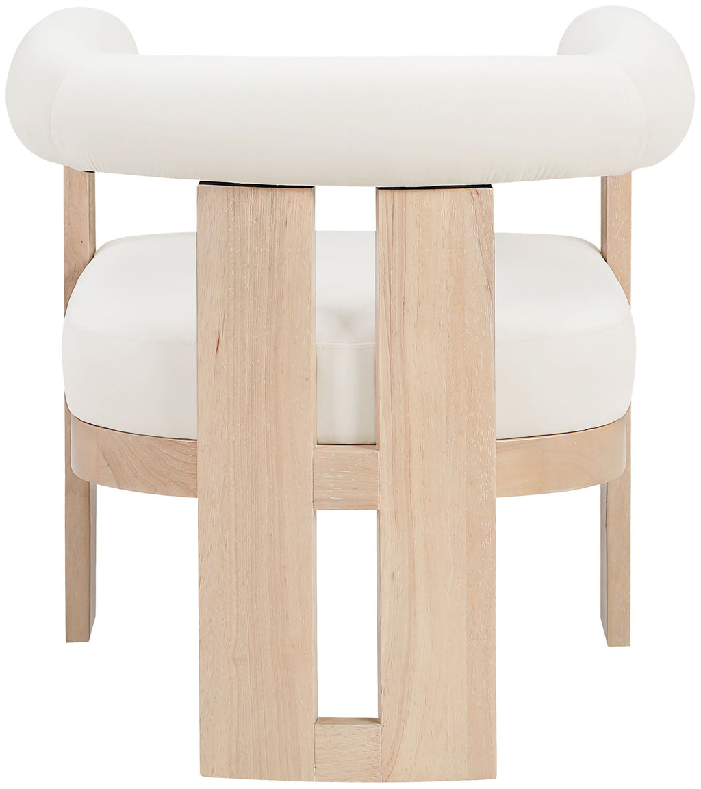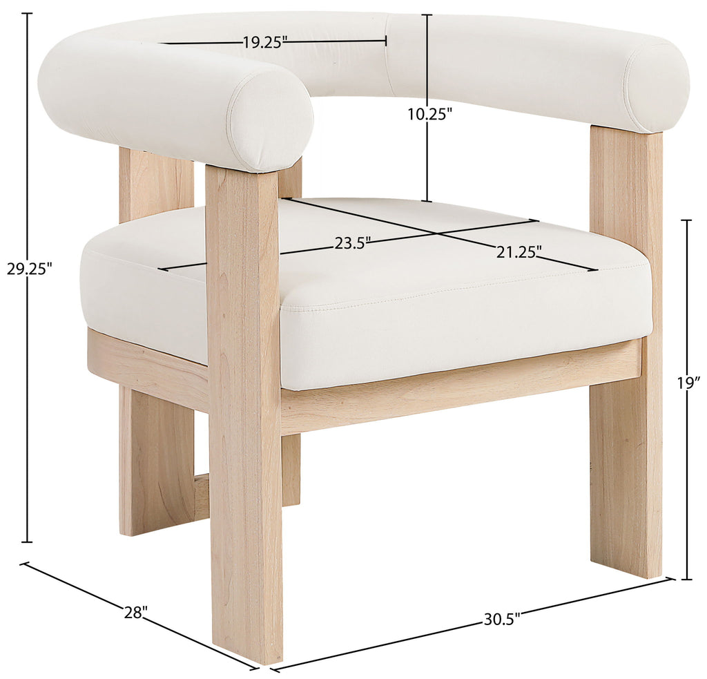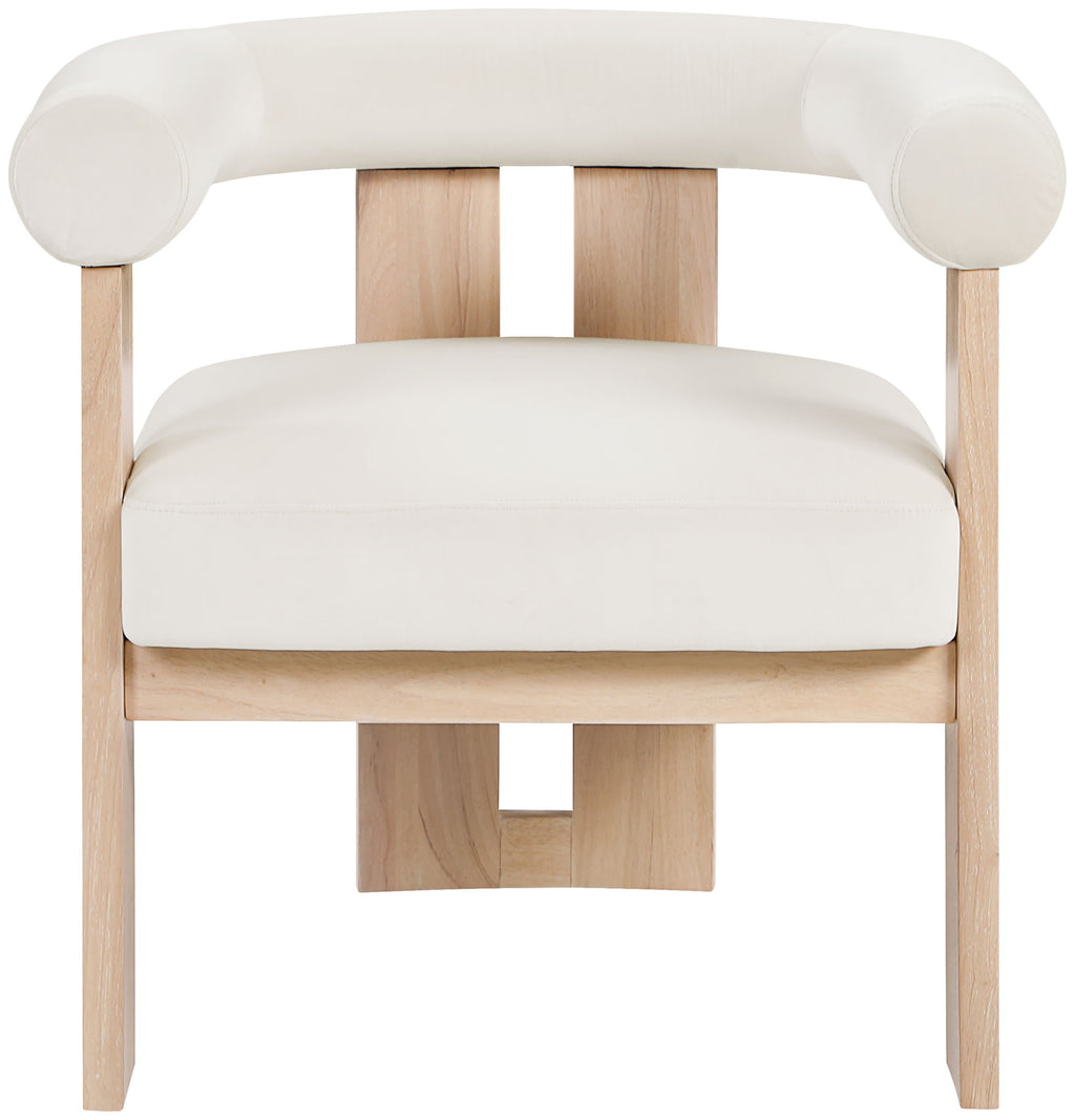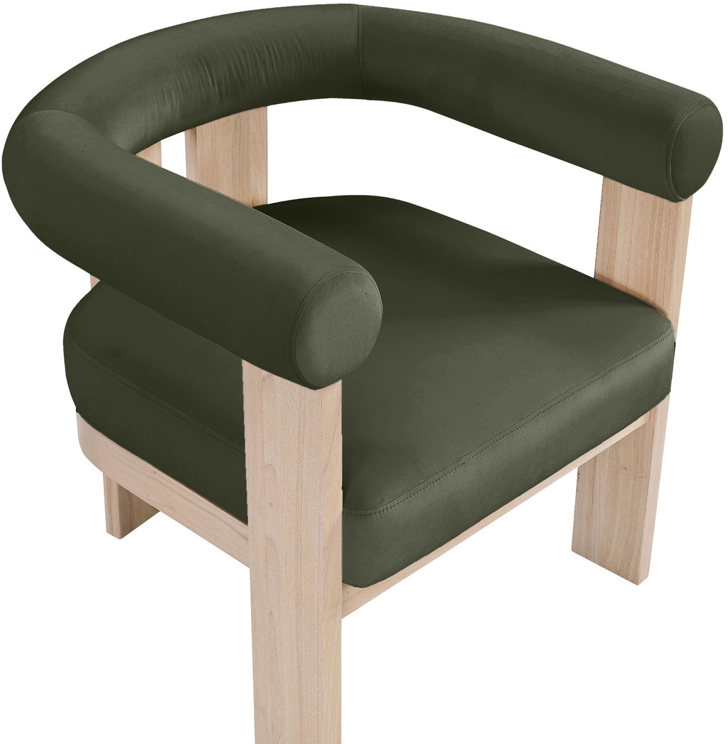 Wrapped in ultra-luxe velvet, the Arienzo upholstered chair captures the elegance of Art Deco design. Its rounded backrest and plush seat rest on sturdy natural-finished solid wood legs for a look that's both sculptural and inviting. A true statement piece, it adds warmth and sophistication to any room.