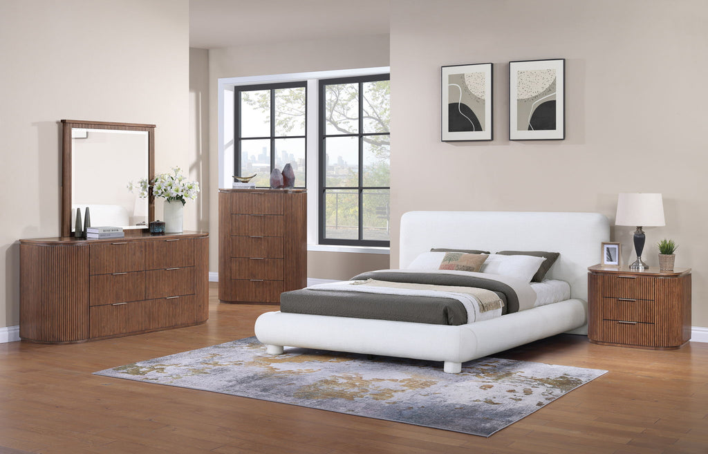 Texture takes the lead with the Astrid solid wood and oak veneer desk. Wrapped in sleek fluted wood and finished in a deep, moody tone, this contemporary design is both bold and refined. Whether styled in a bedroom or living space, it delivers effortless storage with standout style.