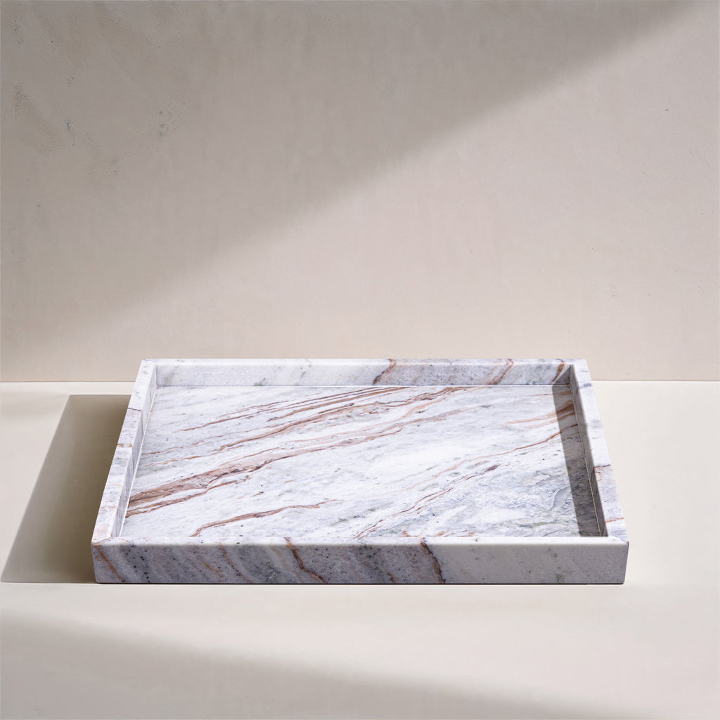 Capri marble brings depth and refinement to the Barletta square tray, a sculptural tabletop accent with sharp edges and timeless charm. Each tray features its own distinct veining, making every piece naturally one-of-a-kind.