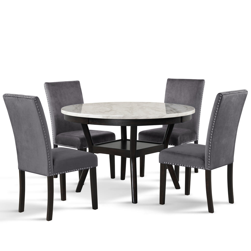 The Celeste Dining Set is an exquisite combination of modern sophistication and enduring craftsmanship. This set includes a chic round dining table with an espresso base and a faux marble top, accompanied by four stunning velvet chairs. Crafted from solid Rubberwood and high-quality manufactured wood components, the dining set is designed for longevity, ensuring a lasting addition to your dining space. The glossy finish on the tabletop provides both heat and water resistance, ensuring easy cleaning and protection from wear. The white and gray veined faux marble top, complemented by deep espresso legs, creates a contemporary and glamorous ambiance. Luxurious seating awaits with the soft and durable 100% polyester velvet fabric covering sumptuous memory foam cushions, offering both comfort and easy maintenance. Tailored for elegance, the rich and luxurious colors of the velvet chairs are enhanced by silver nailhead trim, providing a sparkling final touch to this impeccable dining set. Elevate your dining experience with the Celeste dining set—a fusion of contemporary glamour and enduring quality.