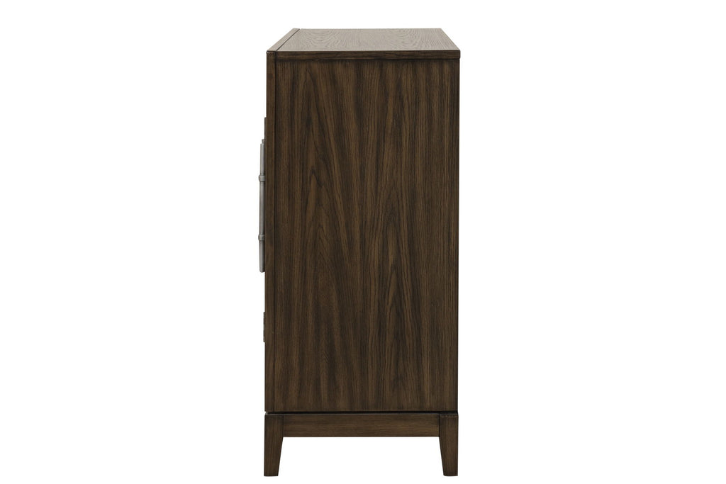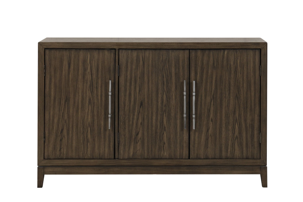 The Cityscape Dining Server / Buffet offers both style and practicality, making it an ideal addition to your dining room. Crafted from a blend of resilient Rubberwood solids, manufactured woods, and real Oak veneers, this sideboard showcases the natural beauty of wood while ensuring long-lasting durability. The sleek lines and dark walnut finish give it a modern, industrial-inspired aesthetic that fits seamlessly into a variety of décor styles. Behind the cabinet doors, you'll find two large drawers perfect for storing linens and flatware, along with spacious open shelving designed to hold china and larger dining essentials. This server provides ample storage while maintaining a refined and sophisticated look, perfect for any dining space.