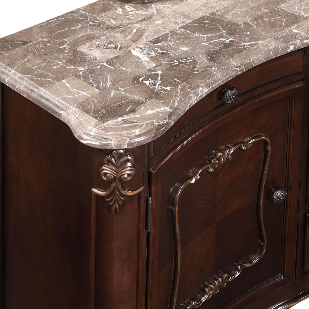 The Royal Classics Constantine Sideboard / Server in cherry combines heirloom craftsmanship with functional elegance, making it a refined addition to any dining room. Expertly crafted from solid pine and premium fancy face birch veneers, this piece ensures lasting beauty and durability. The multi-step finish enhances the natural wood grain, while delicately burnished gold tipping highlights the intricate carvings, adding a touch of luxury to its design. Inspired by 18th-century Rococo style, the sideboard features ornate ornamentation and carvings that bring a sense of regal sophistication to your home. The genuine marble top follows the furniture's graceful curves, while bowfront drawers and cabriole legs complete its lavish look. For practical use, the sideboard offers three velvet-lined drawers for flatware, spacious open shelving behind doors for bulkier items, and additional drawers for table linens or hosting essentials—making it both elegant and versatile, perfect for organizing and showcasing in style.