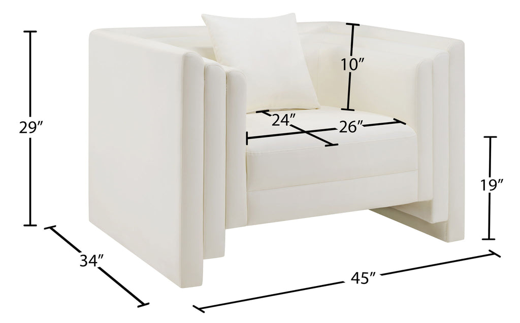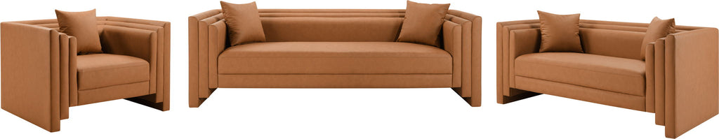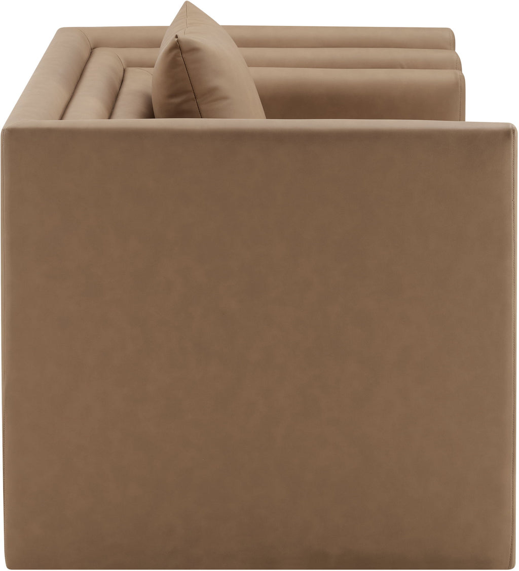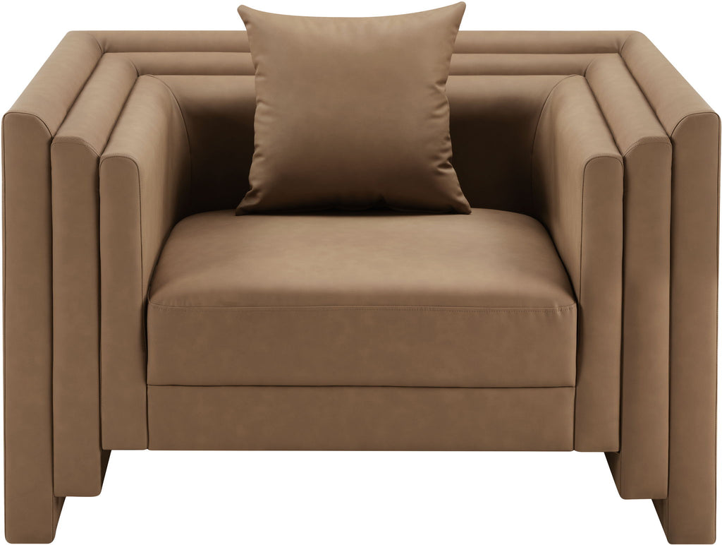 Soft tan vegan leather and a bold, structured silhouette give the Everett chair a modern edge. Cushioned with plush pillows and built with a solid wood inner frame, it's designed for both style and comfort. Perfect for elevating any room, this chair creates a striking focal point while inviting you to sit back and relax.
