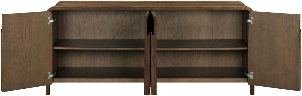 Rich oak veneer and solid wood give the Harmony sideboard its warm, mid-century appeal, while curved edges soften the silhouette. Vertical sculptural pulls add a bold, architectural touch that feels both classic and fresh. Whether storing dinnerware or styling your favorite decor, this piece brings refined versatility to any room.