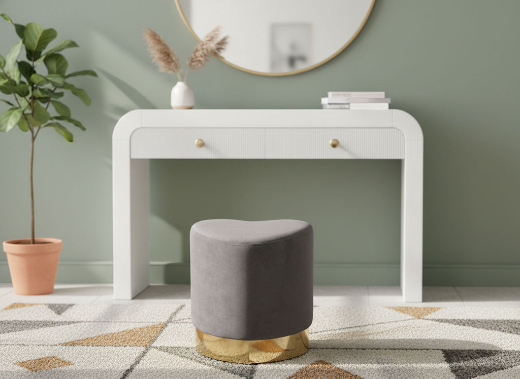 Show your room a little love with this heart-shaped ottoman/stool. The beautiful-colored upholstery covering the top and sides of this ottoman is sumptuous to the feel, ensuring its luxurious look from all angles. Thetone base complements the of the stool, adding a distinct contrast to the presentation. The velvet material is rich and sleek, so it pampers your feet while you prop them up at day's end.