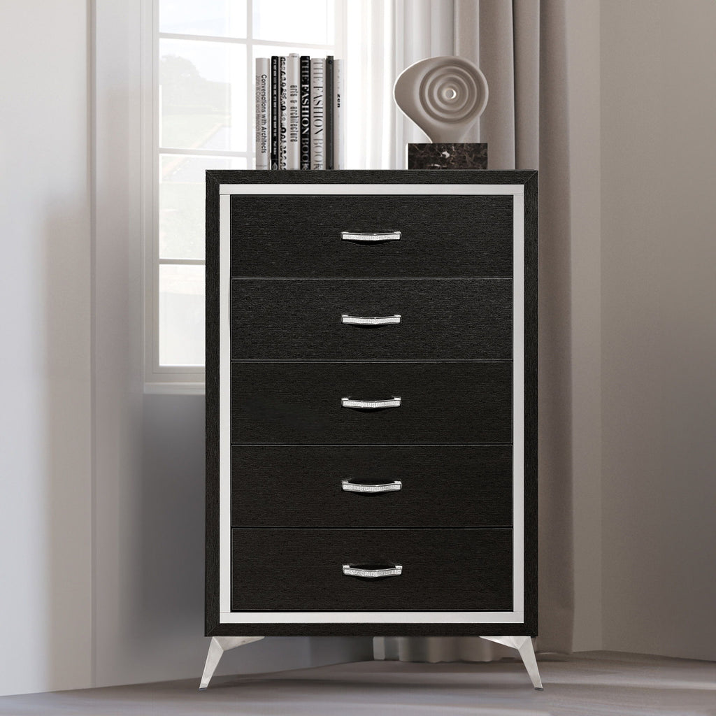 The Huxley 5-Drawer Chest combines contemporary glam with durable construction for a stylish addition to your bedroom. This vertical dresser is crafted from manufactured woods and eco-friendly decorative laminate, ensuring it will stand the test of time. The design features clean lines with metallic accents and flared silver legs, adding a modern touch. Its rich finish provides a sleek, sophisticated look that is both timeless and modern, highlighting the metallic accents and smooth surfaces for a chic and polished aesthetic. The quality drawer construction includes English dovetail joinery and smooth-rolling center glides for long-lasting operation. Functional and fashionable, this chest offers ample storage for clothing, with chic, crystal-studded drawer pulls for easy access.