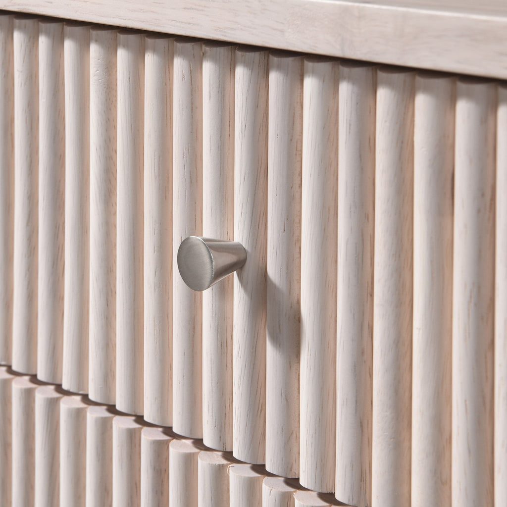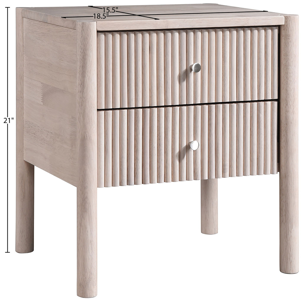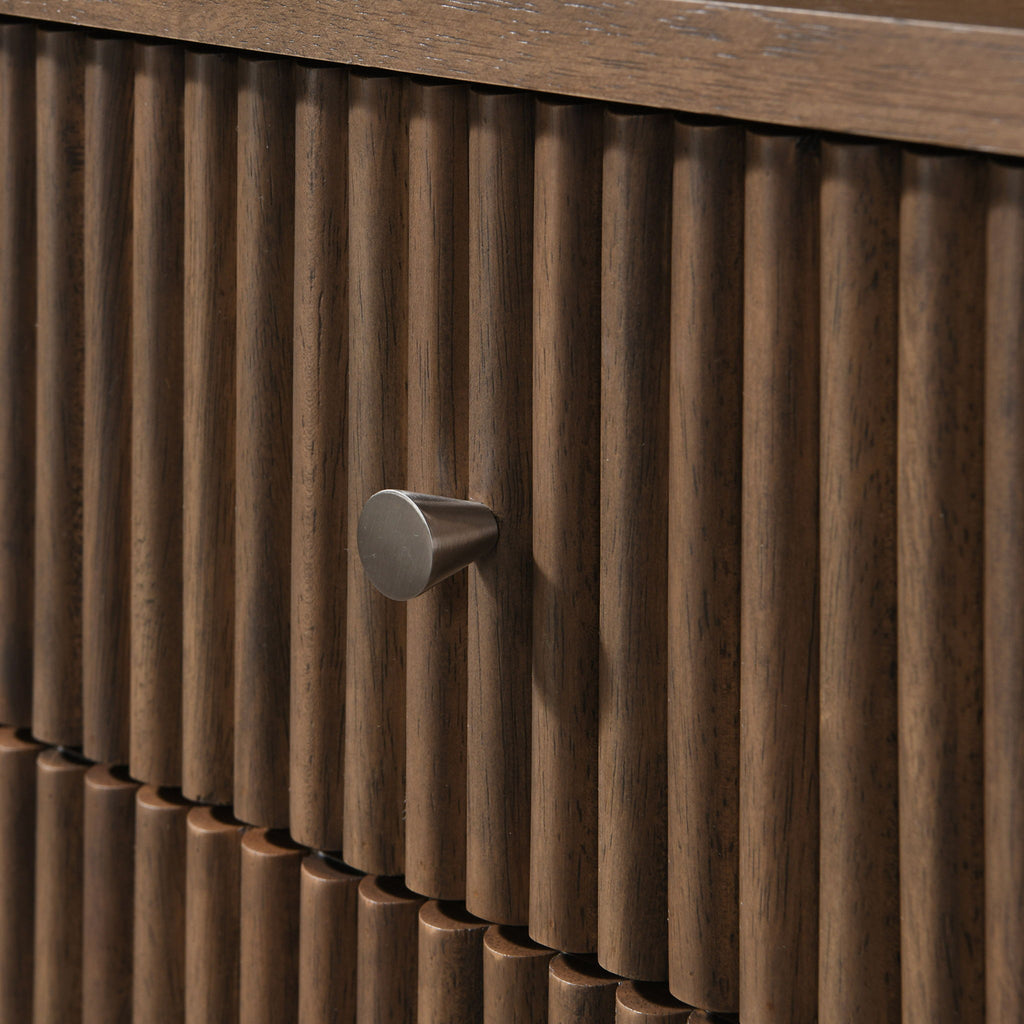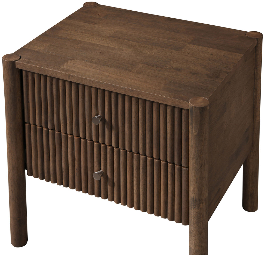 The Kivo solid wood nightstand in a rich finish is the perfect companion to its matching bed. Vertical slatted drawer fronts mirror the same mid-century design details, creating a cohesive and refined bedroom set. With two spacious drawers and a sturdy, solid wood build, it balances style with everyday function.