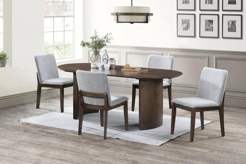 The Kody Dining Set features a durable oval table and chairs, crafted from solid rubberwood, engineered woods, and oak veneers. A rich finish brings out the natural grain. The table’s sleek shape and pedestal base offer modern sophistication, while plush foam seats in textured forest green polyester provide comfort and easy care. Seating for six makes this set ideal for family dining or casual entertaining.