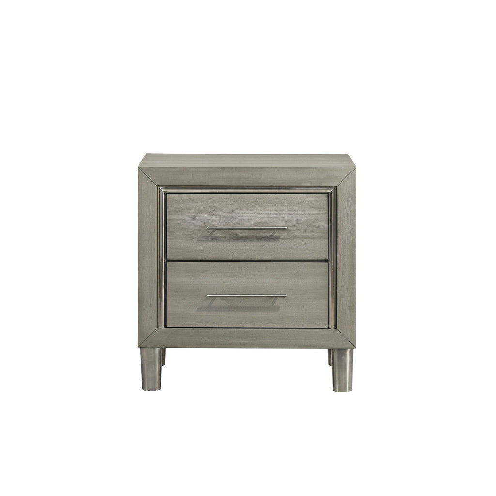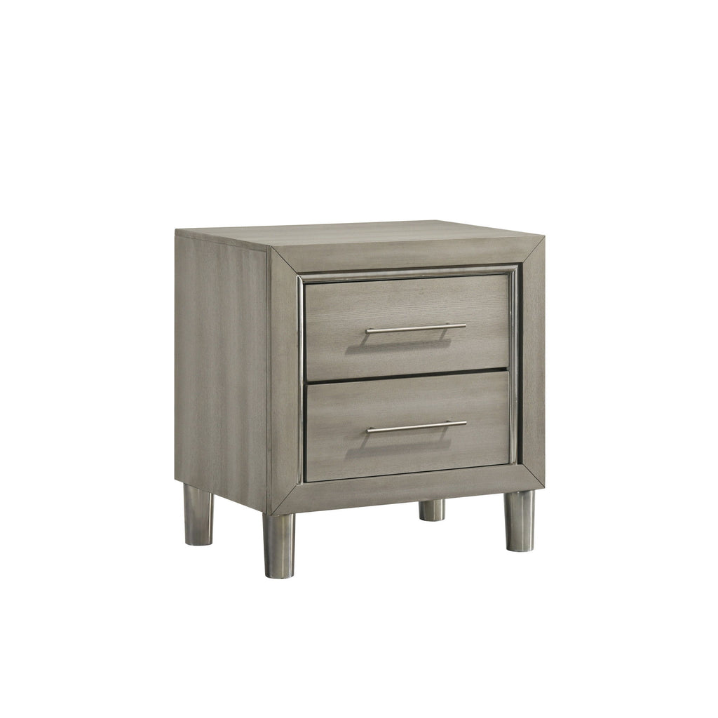 The Lennox 2-Drawer Nightstand in Gray is the perfect blend of modern elegance and lasting durability, designed to elevate your bedroom. Crafted with premium engineered woods and an eco-friendly gray ash laminate, its sleek, contemporary design brings both style and functionality. Lustrous metallic trim accents complement the light gray finish, adding a sophisticated touch that enhances its modern appeal. Superior craftsmanship shines through with its spacious drawers, expertly constructed with four-corner English dovetail joinery and smooth ball-bearing glides, ensuring effortless operation and long-term durability. The Lennox Nightstand combines practicality with refined style, making it a standout piece for any space.