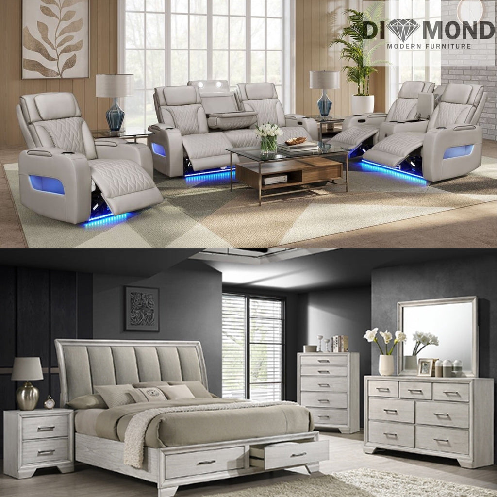 - Living Room – A stunning 3-piece LED Reclining Set in Power Sand Color, featuring built-in LED lighting and luxurious, power reclining comfort.