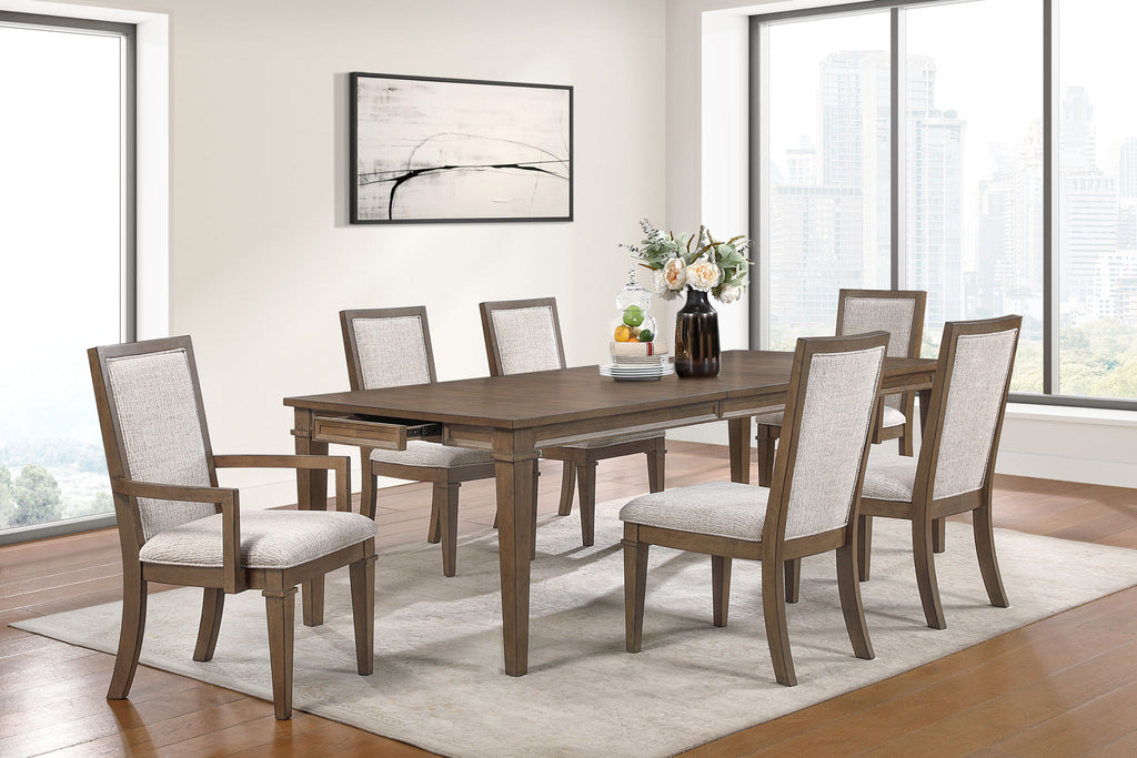 The Mariana Wood Dining Room Set is a masterful combination of timeless elegance, durability, and comfort. Crafted from solid Rubberwood, premium manufactured woods, and authentic Acacia wood veneers, the set captures the natural beauty of wood with enduring strength. Each piece features an artisanal multi-step finish in vintage Mocha, with hand-distressed details like rasping, clefting, and threading for a richly textured, time-worn appearance. The generously sized table, with its included 18" leaf, expands from 78" to 96", comfortably seating up to 8 guests. Thoughtfully designed storage drawers in the apron add convenience by keeping utensils within easy reach. The chairs, upholstered in soft, high-density foam cushions with premium polyester fabric, offer luxurious comfort for extended gatherings. Combining traditional elegance, rustic charm, and Colonial craftsmanship, this heirloom-quality dining set is perfect for elevating any dining space with warmth and style.