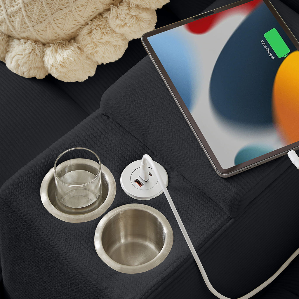 U Shaped Sectional Sofa Bed With Storage, 4 Seater, Features Cup Holders And Soft Foam Cushions - Black