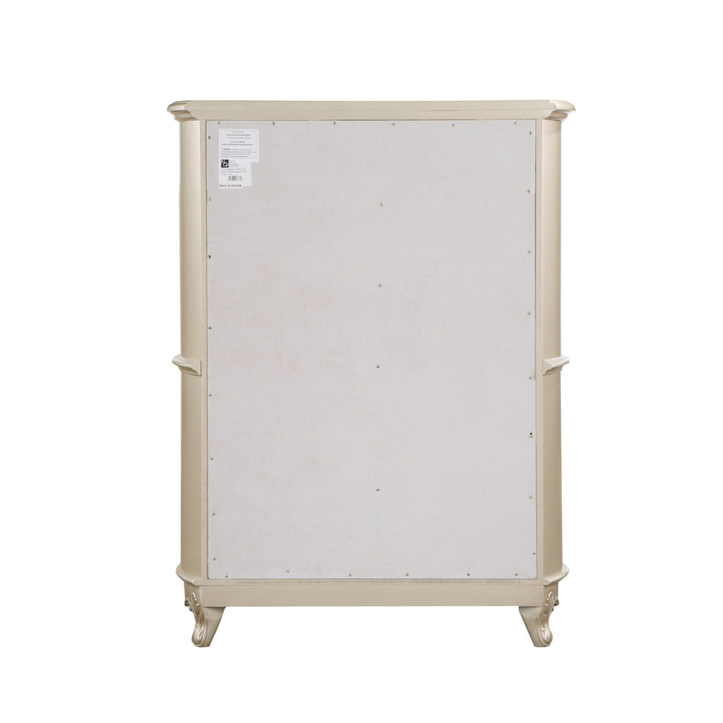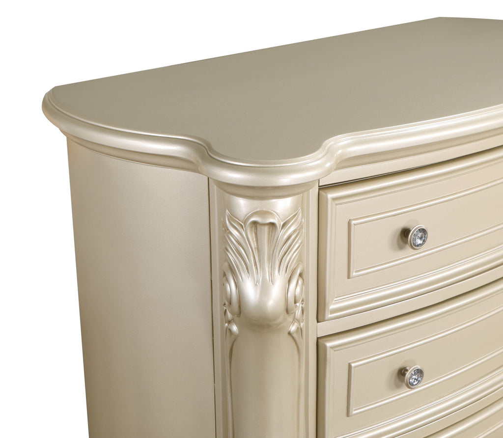The Monique 5 Drawer Chest in Champagne combines heirloom quality construction with French Provincial elegance. Crafted from poplar solids and birch veneers, this chest offers enduring strength and durability. Its design reflects the charm of French countryside homes, featuring soft curved lines, intricate carvings, scalloped edges, and decorative moldings that add a touch of sophistication. The multi-step champagne finish, meticulously applied, enhances the natural beauty of the wood, while antique gold glazing highlights the moldings and ornamental carvings. The drawers, built with French and English dovetail joinery, glide smoothly on full-extension mechanisms and feature finished interiors for snag-free storage. Practical features include a velvet-lined top drawer, a cedar-lined bottom drawer, and ample storage for clothing in the spacious five-drawer chest. Combining traditional style with modern comforts, the Monique 5 Drawer Chest is a luxurious addition to any bedroom.