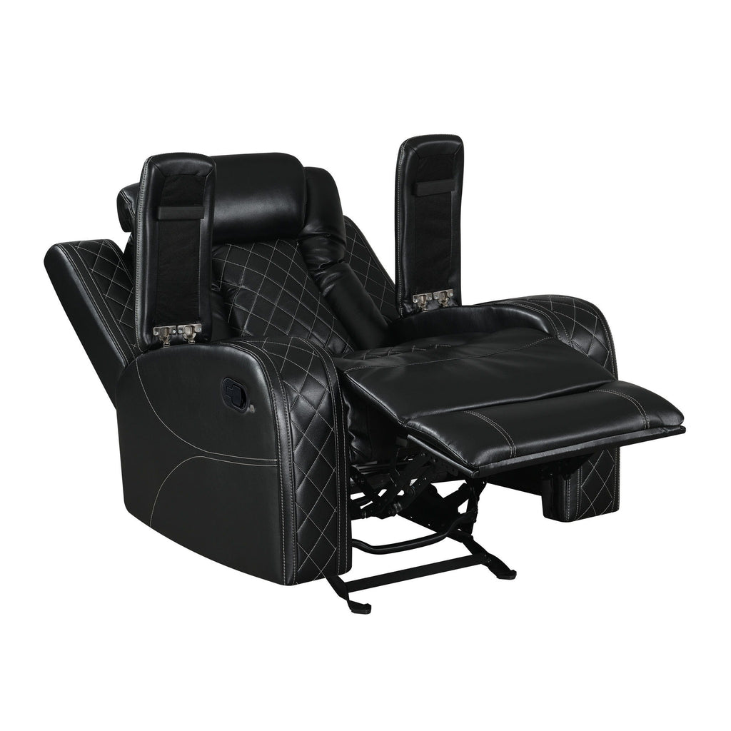 Meet the Orion Glider Recliner, where durability meets comfort. Crafted with a robust blend of hardwoods and manufactured wood, its sturdy frame ensures lasting strength. Sink into luxury with its soft, breathable upholstery, a lavish mix of polyester and PU for an indulgent feel. Enjoy seamless reclining action thanks to top-quality mechanisms, while high-density foam and pocket coil cushions cradle you in comfort. This recliner's sleek design is accentuated by white contrast stitching and a distinctive diamond pattern, elevating any space with its contemporary flair. And with lift-up pillowed arms revealing convenient storage compartments, style meets functionality seamlessly. Relaxation awaits in the Orion Glider Recliner—where quality craftsmanship meets modern convenience.