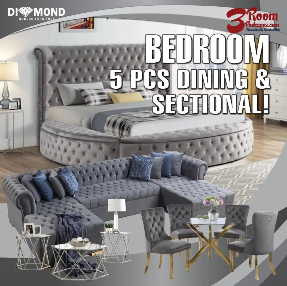 Indulge in the ultimate home transformation with our 3-room package. From the Luxury Cloud Velvet Sectional to the Circle Tufted Storage Bed Frame and the 5-piece Elegant Dining Set, each piece is carefully selected to bring comfort, style, and functionality to your living space. And with the option to add the 3-piece Coffee Table Set, you can complete the look and create a harmonious ambiance in your home. Embrace the luxury and elegance of our curated collection and elevate your living experience to new heights.