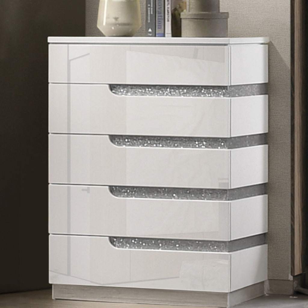 The Paradox Five Drawer Chest combines modern elegance with practical functionality. The gleaming gloss laminate finish offers a sleek, contemporary look while providing scratch and water resistance. Constructed from a combination of solid and manufactured woods, this chest ensures lasting durability. The fully finished drawers offer snag-free storage and glide effortlessly on full-extension, ball-bearing drawer slides. The show-stopping design, featuring a modern finish and glittering mylar inlays, transforms your bedroom into a high-style retreat. With five spacious drawers, this chest provides ample storage space for all your clothing, making it an essential and stylish addition to any bedroom.