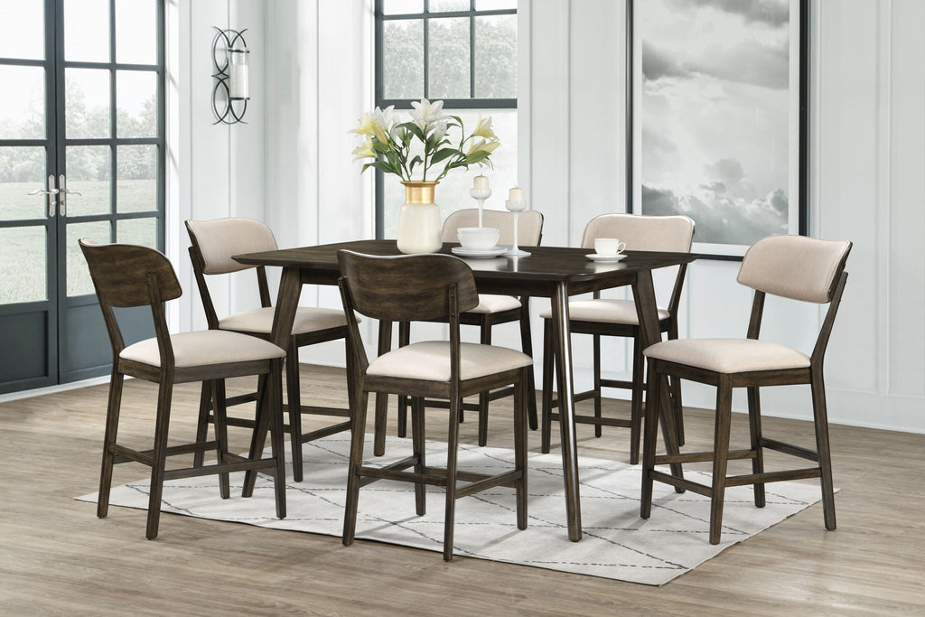 The Rex Mid-Century Modern Wood Counter Dining Set combines sleek design with everyday practicality, making it a great choice for both casual meals and gatherings. This set includes a spacious counter-height table and matching counter stools, all crafted from solid rubberwood, manufactured woods, and oak veneers for durability and long-lasting use. The minimalist design, with clean lines, rounded edges, and angled, tapered legs, captures the essence of classic Mid-Century Modern style. Finished in a rich, hand-rubbed walnut brown with a clear topcoat, the set highlights the natural beauty of the wood grain. Each stool offers comfortable seating with softly curved backrests and resilient foam cushions wrapped in easy-care 100% polyester fabric. Perfect for larger dining spaces, this table comfortably seats up to six, providing the ideal spot for dining and conversation.