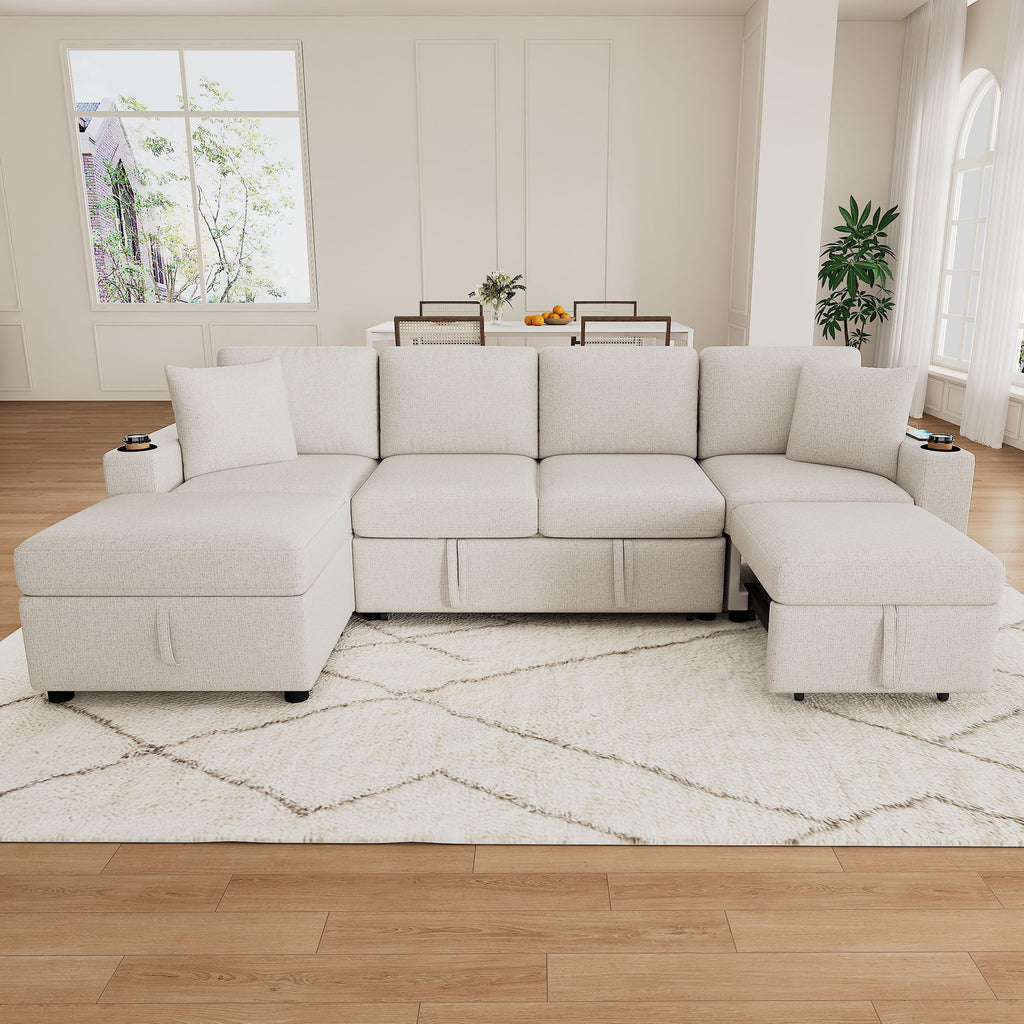 Chenille Sectional Sofa Convertible Pull Out Bed With Storage Ottoman & USB Ports - Beige