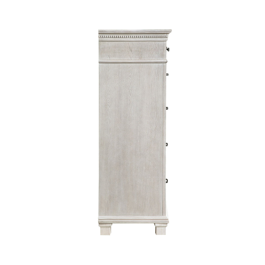 The Silver Sands Chest is built with durable, quality construction using solid pine, manufactured woods, and oak wood veneers, ensuring a strong and stable piece. Its transitional style blends clean, simple lines with a rustic wood finish, creating a calm and inviting atmosphere. The misty gray finish, applied through a meticulous multi-step process, offers a light, weathered look that highlights the natural grain and mineral patterns of the wood. Elegant design features, including a raised base, full return and dentil moldings, and contrasting hardware, add a sophisticated touch. Heirloom-quality drawers with dovetail joinery and three-stage steel ball glides ensure smooth, full-extension operation and can support heavy loads. With five spacious drawers, including a velvet-lined top drawer to protect delicates, this chest provides ample storage for clothing essentials. Combining style, durability, and functionality, this chest is a practical and elegant addition to any bedroom.