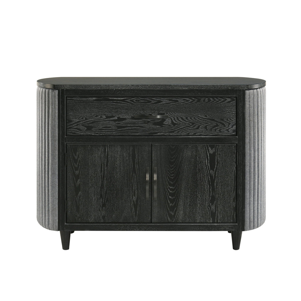 The Skyline Server in Onyx blends modern design with functionality, making it a versatile addition. Crafted from solid Rubberwood, engineered woods, and Ash veneers, it offers durability and style. The Onyx Black finish with gray glazing enhances the wood grain. Textured gray ribbed fabric contrasts elegantly with the dark wood. A spacious top drawer and roomy lower compartment provide ample storage. Ideal as a dining sideboard, entryway accent, or TV stand, it delivers lasting quality and appeal.