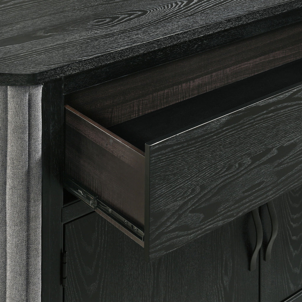 - Mixed Material Mastery: Textured gray ribbed fabric curves around each side of the chest, creating a striking contrast against the dark wood finish, adding visual intrigue while softening the overall look.