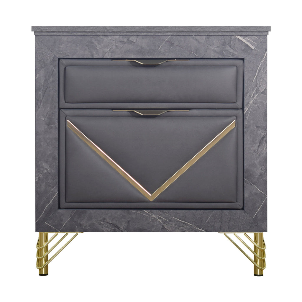 The Symmetry 2-Drawer Nightstand in Charcoal Gray blends style and function, making it a must-have for modern bedrooms. Crafted from premium woods with an eco-friendly gray marble laminate, it offers durability and a sleek look. Ultra-soft gray fabric drawer fronts, adorned with gold metal and mylar accents, add a touch of glamour. English dovetail drawers glide smoothly on ball bearings, providing reliable storage. This elegant, practical nightstand enhances any bedroom with style and function.