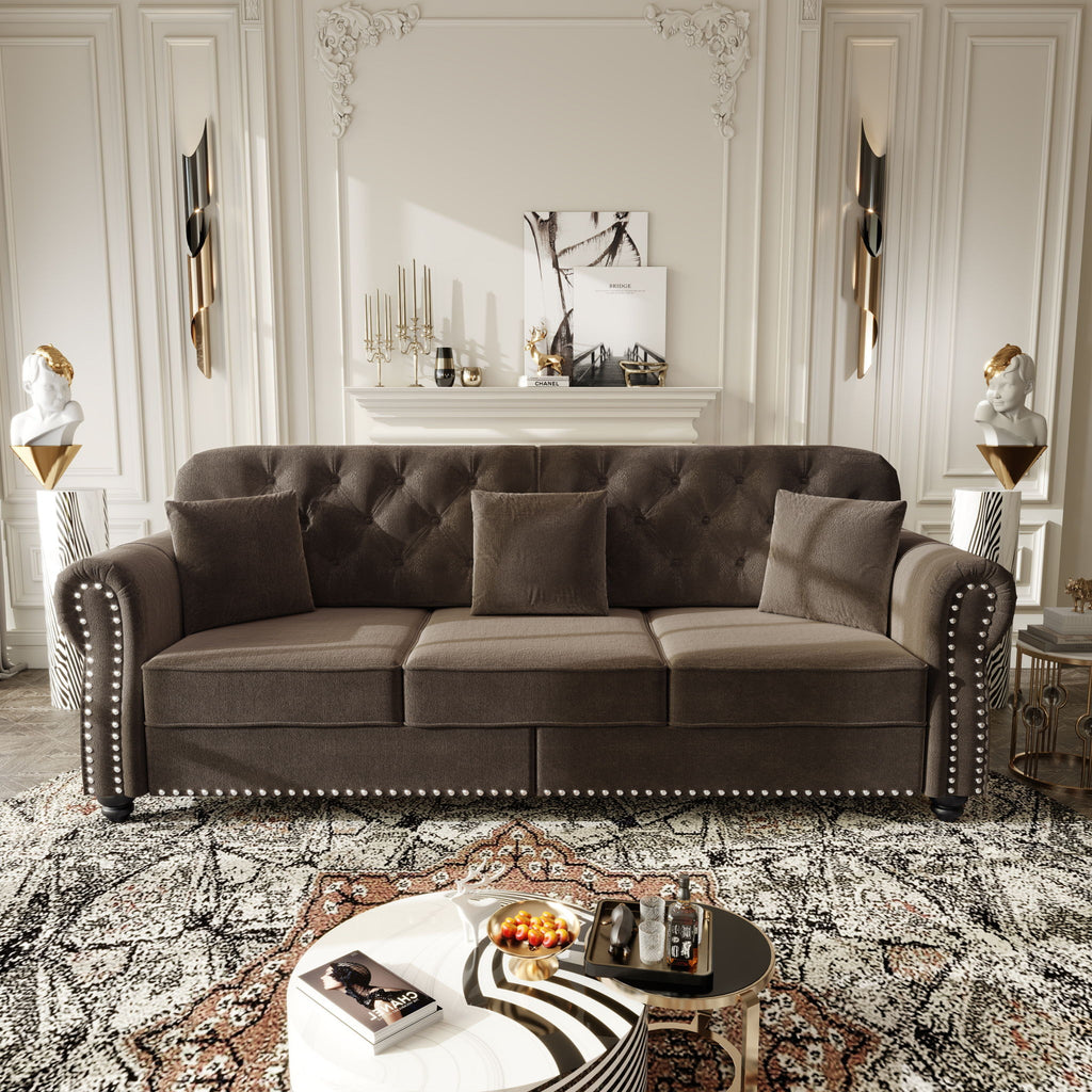 Upholstered Sofa With Nailhead Trim And Rolled Armrests, 3 Pillows - Brown