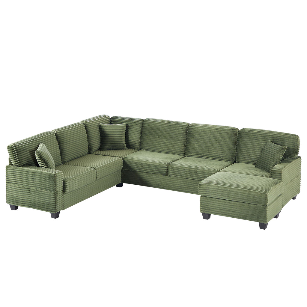 Modern Sectional Sofa U Shaped With Movable Ottoman And Side Storage Pockets Corduroy - Green