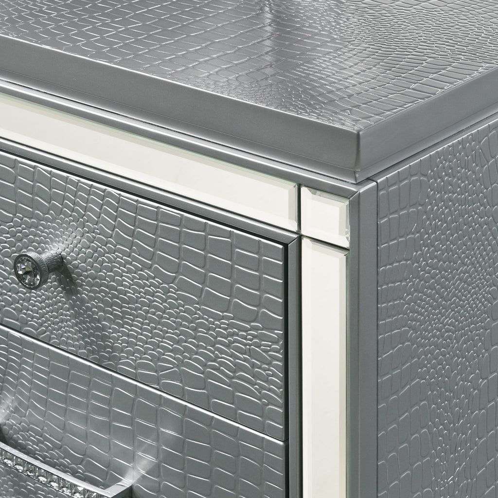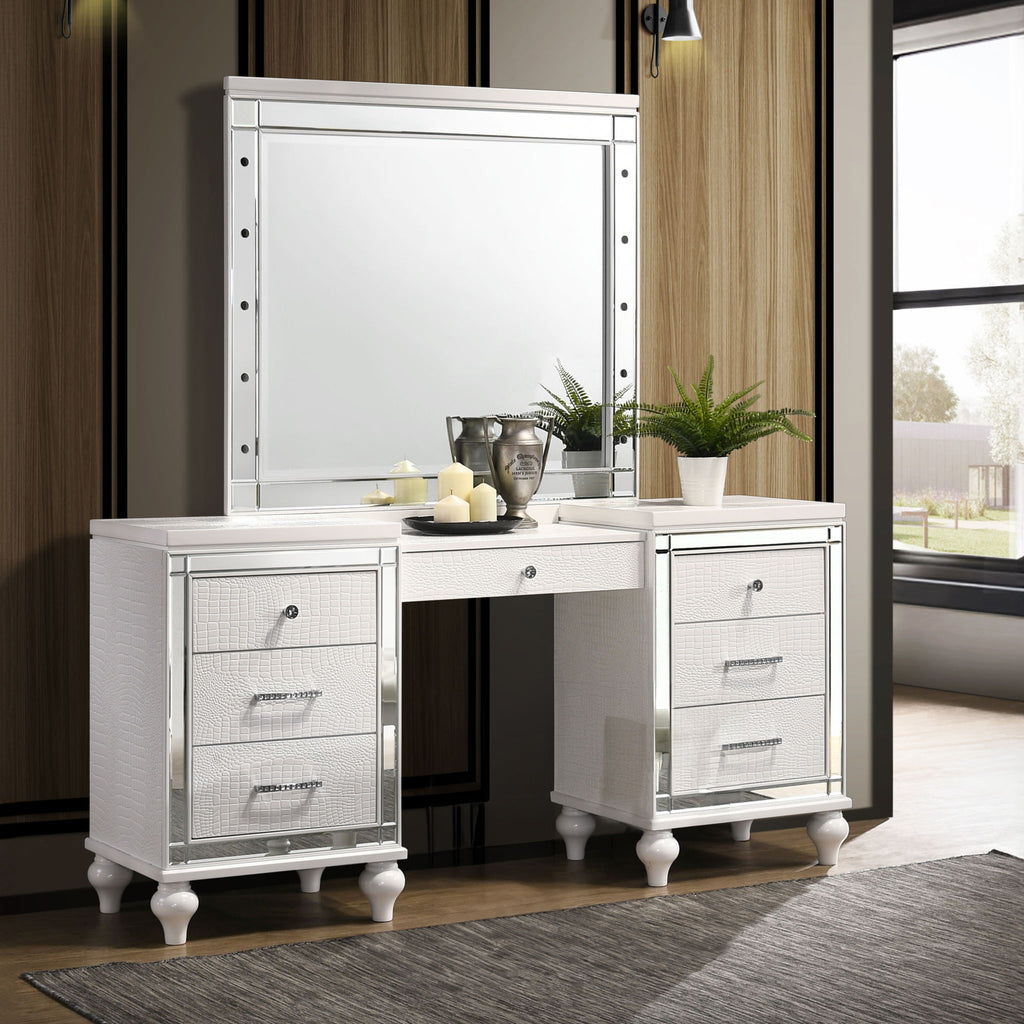 The Valentino Vanity is a stunning addition to any bedroom or dressing area. Made from a combination of manufactured and solid woods with decorative embossed inlays, this set ensures long-lasting quality and distinctive style. The gleaming finish, mirrored trims, crystal-studded drawer pulls, and alligator embossed inlays evoke a Hollywood glam appeal. The seven-drawer vanity table provides ample storage for cosmetics and accessories, including a velvet-lined drawer for jewelry, making it as practical as it is stylish. This exquisite vanity set seamlessly combines functionality with a touch of star quality, bringing an elegant and glamorous touch to your space.